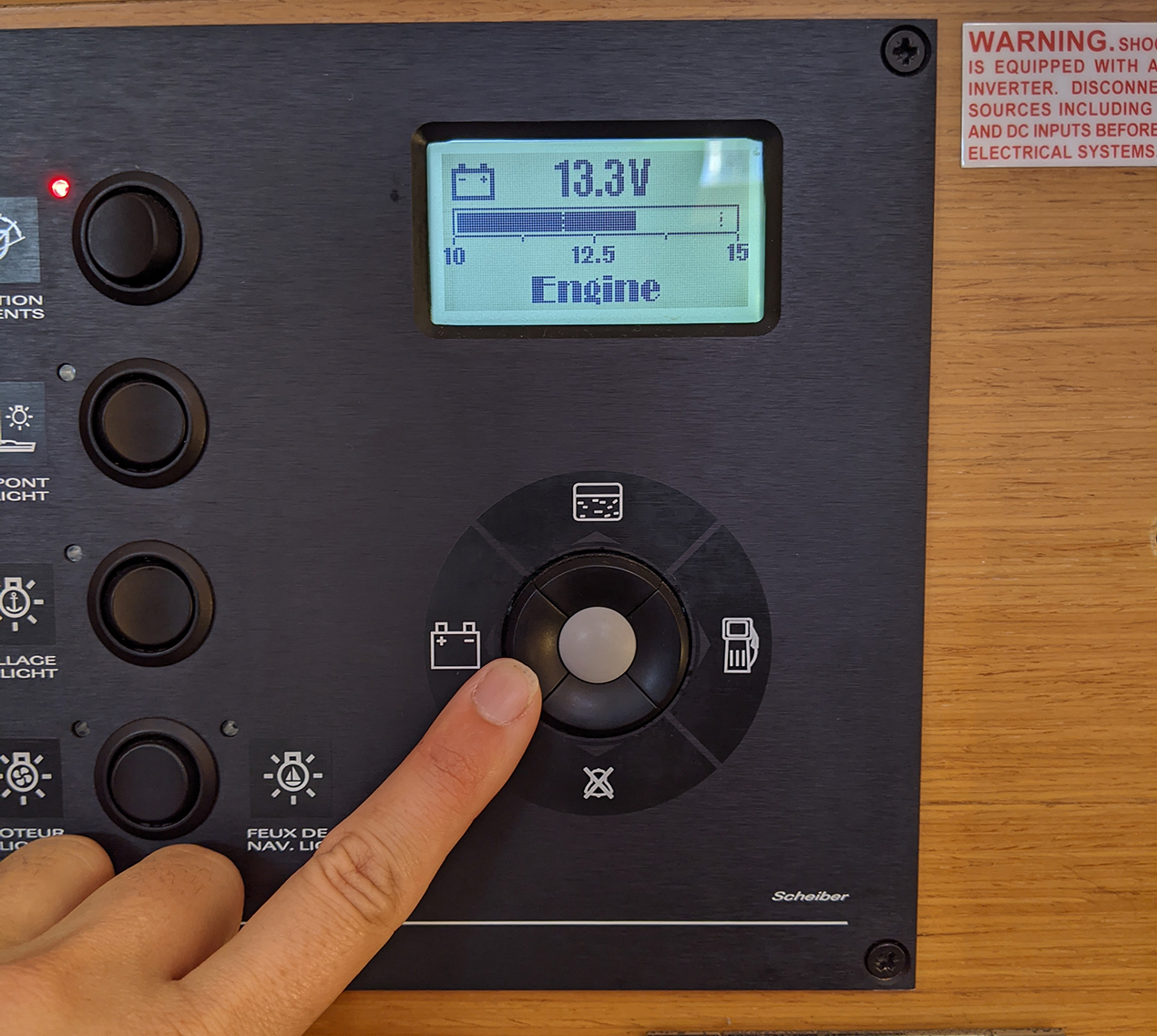 During your sail or while at anchor, periodically take a look at the battery monitor to check on the status of the batteries.