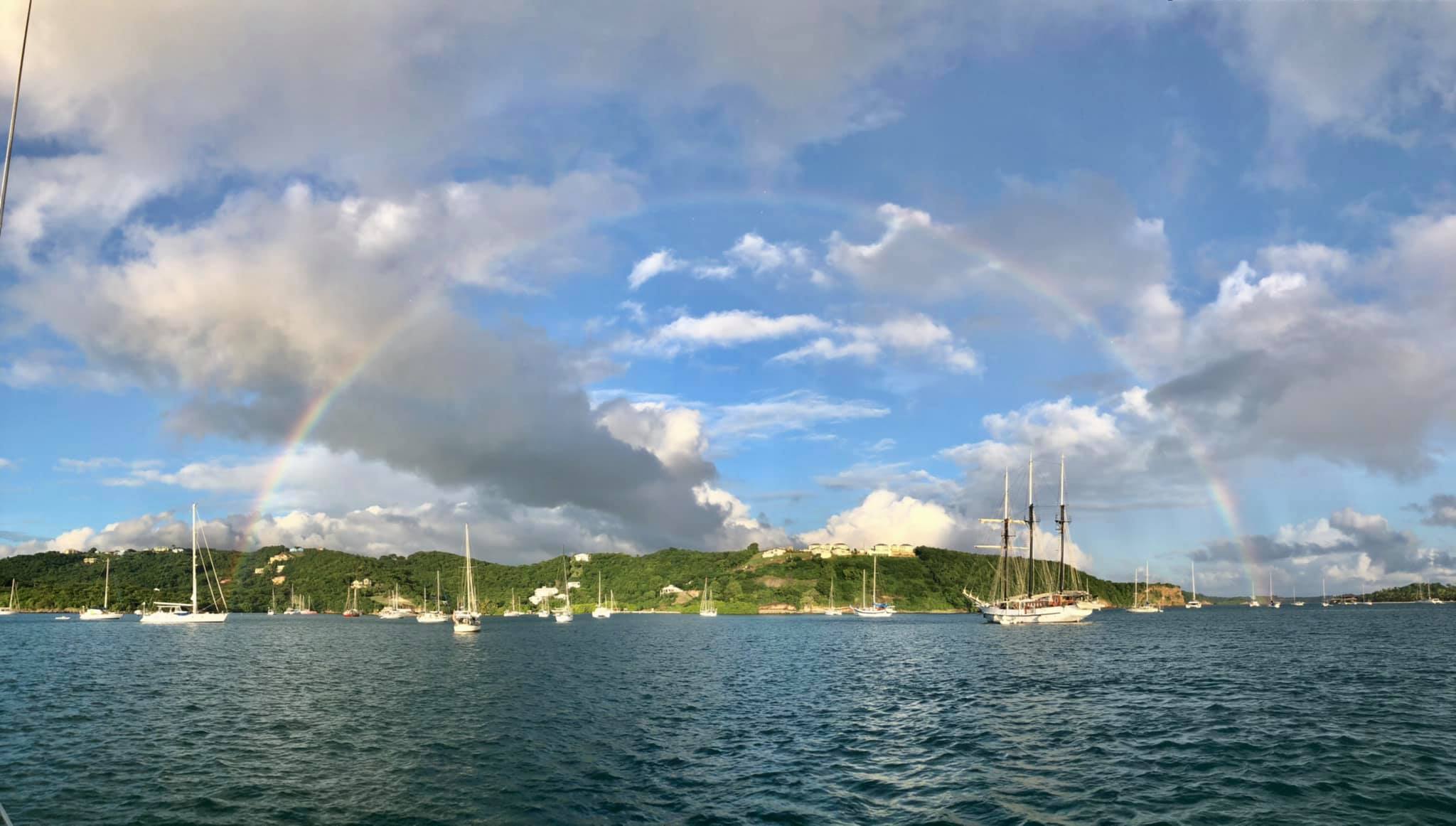 The stunning rainbow that greeted our arrival in Clarke's Court Bay at the end of our maiden sail.