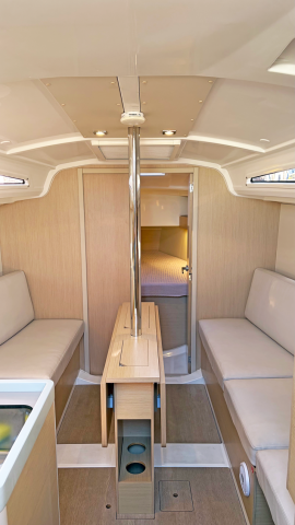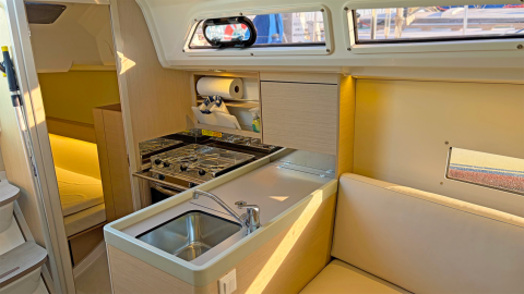 Below deck, headroom is 6.5 feet in all areas where it is possible to stand. To port at the base of the companionway, an L-shaped galley offers storage, a 20 US gallon refrigerator, and a two-burner stove and oven. The large head is divided into a marine toilet on one side and a shower and washbasin on the other. Open entryways and lengthwise berths give Polaris's two double cabins a spacious feel. The cabins can comfortably sleep 4 overnight and the benches in the salon provide extra sleeping space for 2 more.